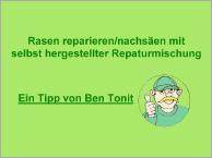Herstellung einer Rasenreparaturmischung Auch der gepflegteste Rasen weist hin und wieder unschöne Fehlstellen oder Löcher auf. Mit Gartenerde (Mutterboden), Rasensamen, Montonit N Mehl und Rasendünger kann man sehr schnell und einfach hervorragende Reparaturmischungen herstellen.